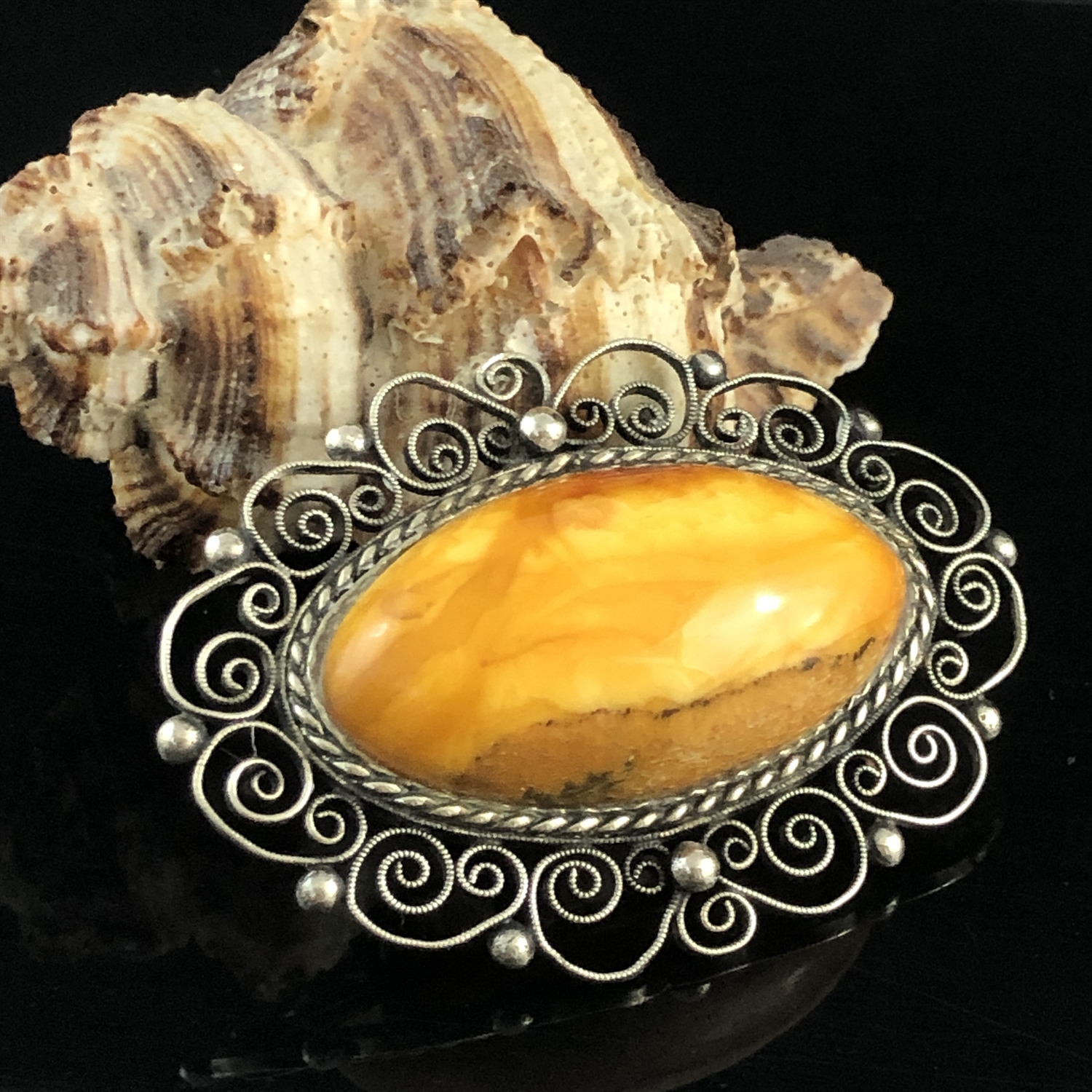 Винтажная янтарная брошь в мельхиоровой оправе , СССР 1970-е гг.